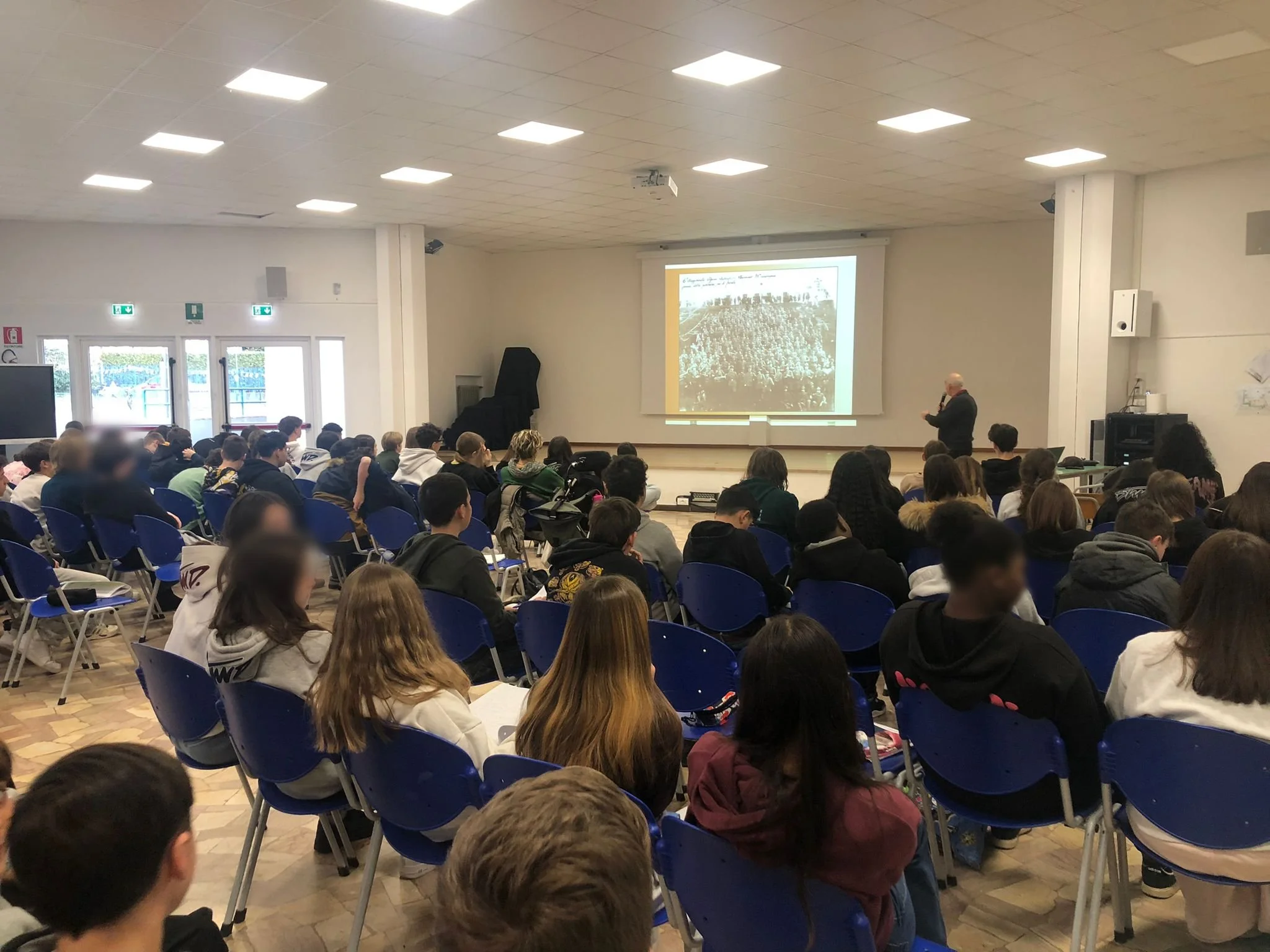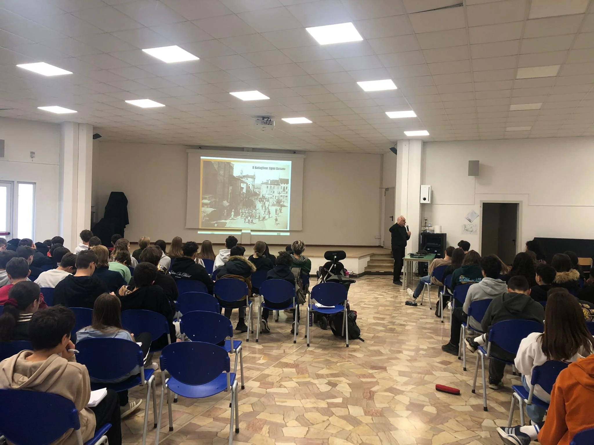 Le classi terze della Scuola Secondaria di Primo Grado hanno incontrato Ruggero Dal Molin che ha illustrato come il territorio di Bassano del Grappa fu investito dagli eventi della Grande Guerra mostrando anche come tanti aspetti del nostro vivere quotidiano traggano origine da quel tragico evento che pure portò il nostro Paese ad acquisire la sua dimensione nazionale. Durante l’incontro, che ha viste coinvolte sei classe terze per un totale di circa 130 studenti, e realizzato grazie alla collaborazione degli Insegnanti (3B e 3E Prof.ssa Elisa Artuso*, 3A Prof.ssa Emanuela Baggio, 3C Prof.ssa Fiorella Chemin, 3D Prof. Daniele Callari, 3F Prof.ssa Federica Simonetto), sono state illustrate fotografie d’epoca, cartine relative alle zone montuose limitrofe e ricostruzioni storico geografiche del periodo 1915-18. Bassano fu una delle capitali del fronte interno in guerra ma anche l'indiscussa “capitale del dolore” perché al termine del conflitto tanti genitori da tutta Italia arrivarono in città per poi salire in Altopiano o sul Monte Grappa alla ricerca della tomba di un loro familiare. Senza dimenticare il ruolo importantissimo che Bassano ebbe anche nelle cerimonie dedicate alle salme dei Caduti sconosciuti raccolte dai vicini campi di battaglia e destinate alla Basilica di Aquileia dove sarà poi scelto il Milite Ignoto infine traslato a Roma all’Altare della Patria. Un evento molto ben riuscito per il quale desideriamo ringraziare gli Insegnanti e in particolare la Prof.ssa Elisa Artuso per il coordinamento dell’iniziativa.